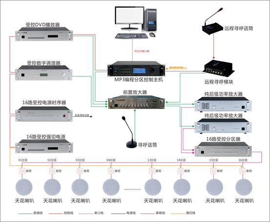此項目是一個大廈,為滿足大廈的商務需求,現需在大廈安裝公共廣播系統系統,進行背景音樂的播放,業務通知等廣播。按照工程功能需求劃分為18個區域,根據系統功能需求,系統采用智能矩陣分區系統,設有系統控制中心,能對整個系統進行實時操作播放背景音樂,前端采用高保真天花喇叭以及壁掛音箱等音響設備,系統可與消防中心進行聯動,當有緊急情況時,可通過系統來實現消防報警,保護人身財產的安全。