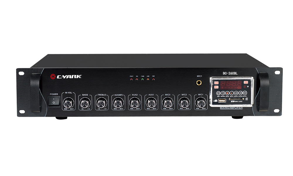 1、3路話筒輸入,3路AUX輸入,1路MP3輸入,1路AUX輸出;100V、