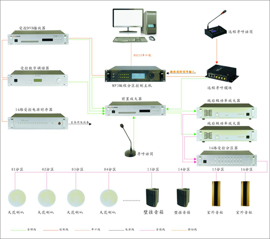 根據功能區域共分為5個區域,具體分布如下:訓練場、宿舍、綜合樓各樓層、門衛、食堂等為了提高部隊的弱電整體使用需求,提供部隊的整體形象,滿足現代化部隊的公共背景音樂播放,現擬在部隊背景音樂廣播系統,公共/應急廣播為部隊日常提供休閑的背景音樂、日常部隊緊急信息的快速發布;