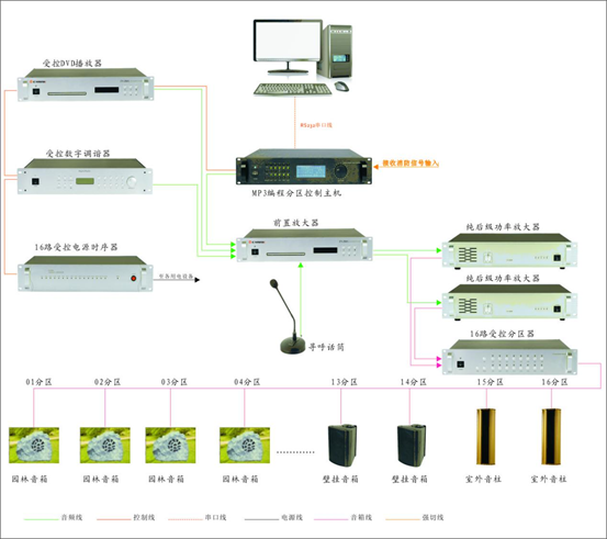 根據功能區域共分為3個區域,具體分布如下:室內活動室、室外活動區、綠化區等等為了提高小區的弱電整體使用需求,提供小區的整體形象,滿足現代化小區的公共背景音樂播放,現擬在小區背景音樂廣播系統,公共/應急廣播為小區日常提供休閑的背景音樂、日常小區緊急信息的快速發布;