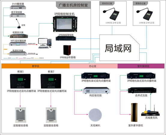 This project is a school, in order to meet the school teaching needs, in the teaching building, office buildings, laboratory buildings, playgrounds and other office space to install the public address system, to play regular time playing bell, playing English listening and so on.