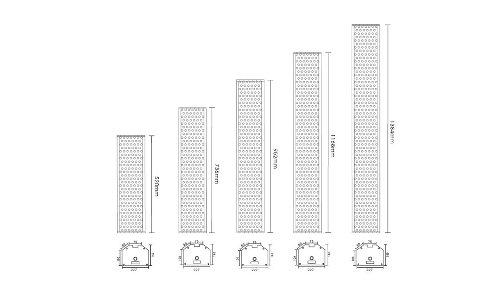 Size | 520x227x125mm | 736x227x125mm | 952x227x125mm | 1168x227x125mm | 1384x227x125mm |