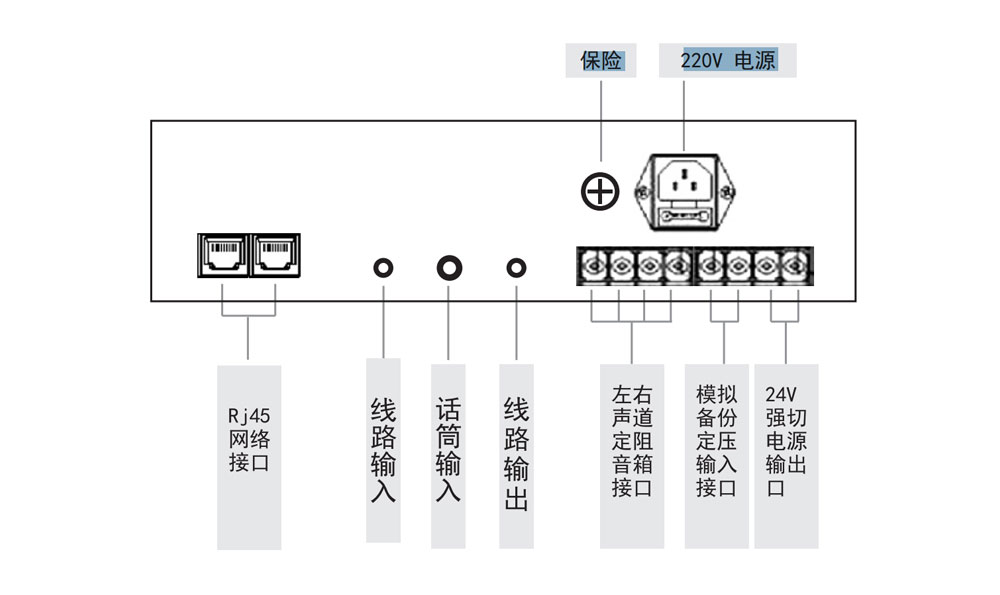 4、本地具有一個雙聲道線路輸入接口、一個話筒輸入接口,一個線路輸出接口,在本地能外接話筒以及線路輸入設備進行本地擴聲,能對本地話筒及線路輸入音量進行調節,能 輸出至功放進行擴聲;