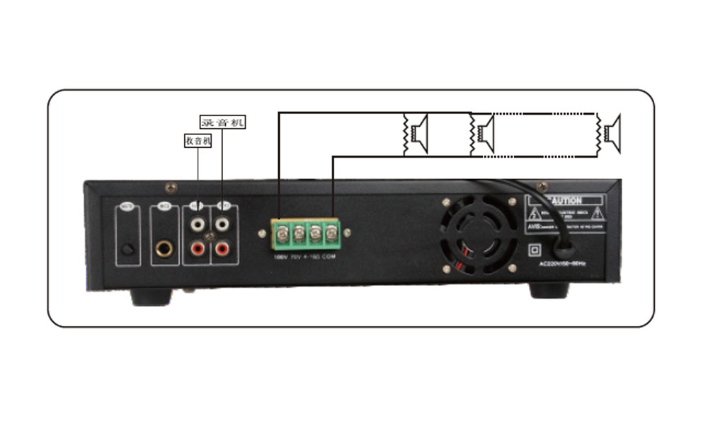 1,1-way microphone input, 2-way AUX input, 1 0 0 V / 70V constant-voltage output and 4 - 1 6Ω constant resistance output; 5-cell LED level indication.