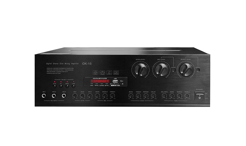 1.雙混響設計,方便調音,帶USB播放功能 2.專業ECHO+REVERB回音系統 3.耐長時間連續使用,耐高溫,耐干燥,耐不穩定電壓 4.改進電路技術,讓聲音更加圓潤 5.隱蔽式音質調整開關,避免任意調整傷害系統器材 6.大功率輸出,效果更加優秀 7.自動偵測VOD訊號源,可切換自動或手動 8.自動記憶原設定咪及音樂音量 9.可設置最大音量開啟度,保護系統。