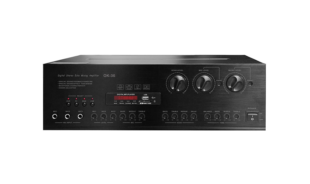 1.雙混響設計,方便調音,帶USB播放功能 2.專業ECHO+REVERB回音系統 3.耐長時間連續使用,耐高溫,耐干燥,耐不穩定電壓 4.改進電路技術,讓聲音更加圓潤 5.隱蔽式音質調整開關,避免任意調整傷害系統器材 6.大功率輸出,效果更加優秀 7.自動偵測VOD訊號源,可切換自動或手動 8.自動記憶原設定咪及音樂音量 9.可設置最大音量開啟度,保護系統。